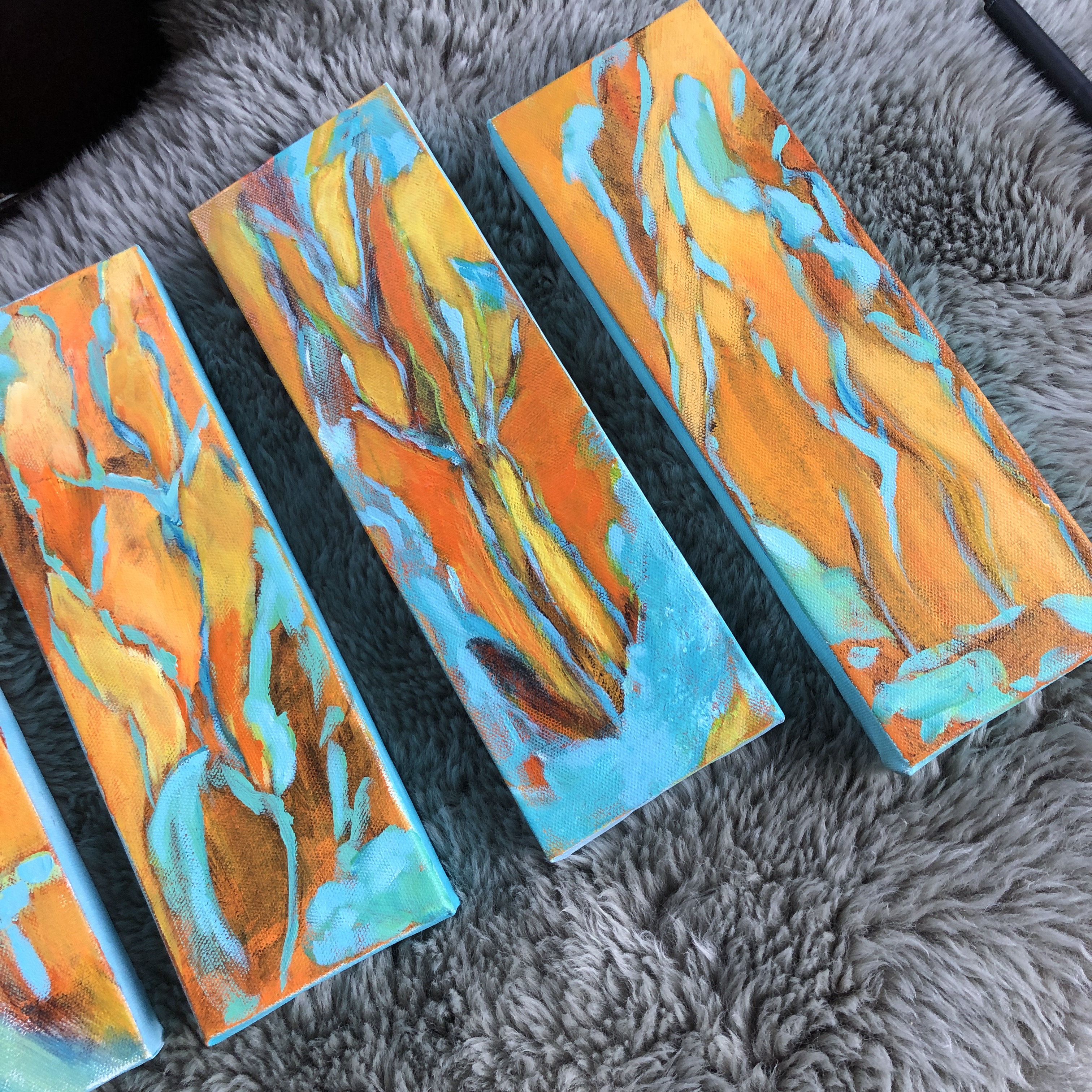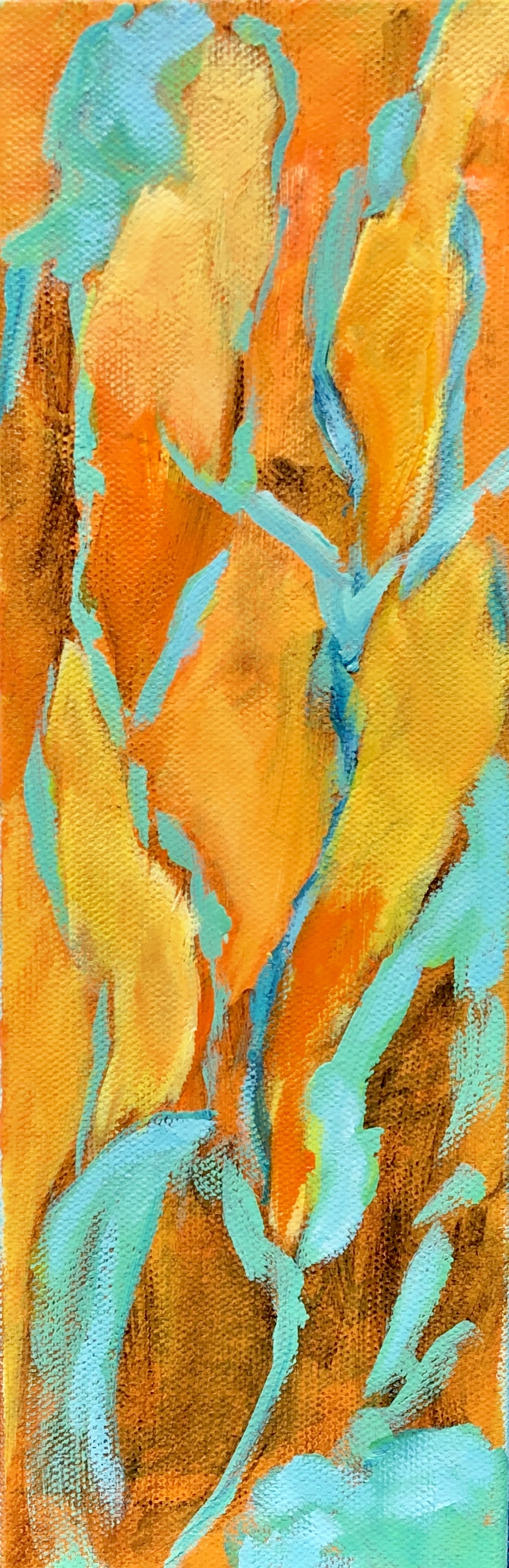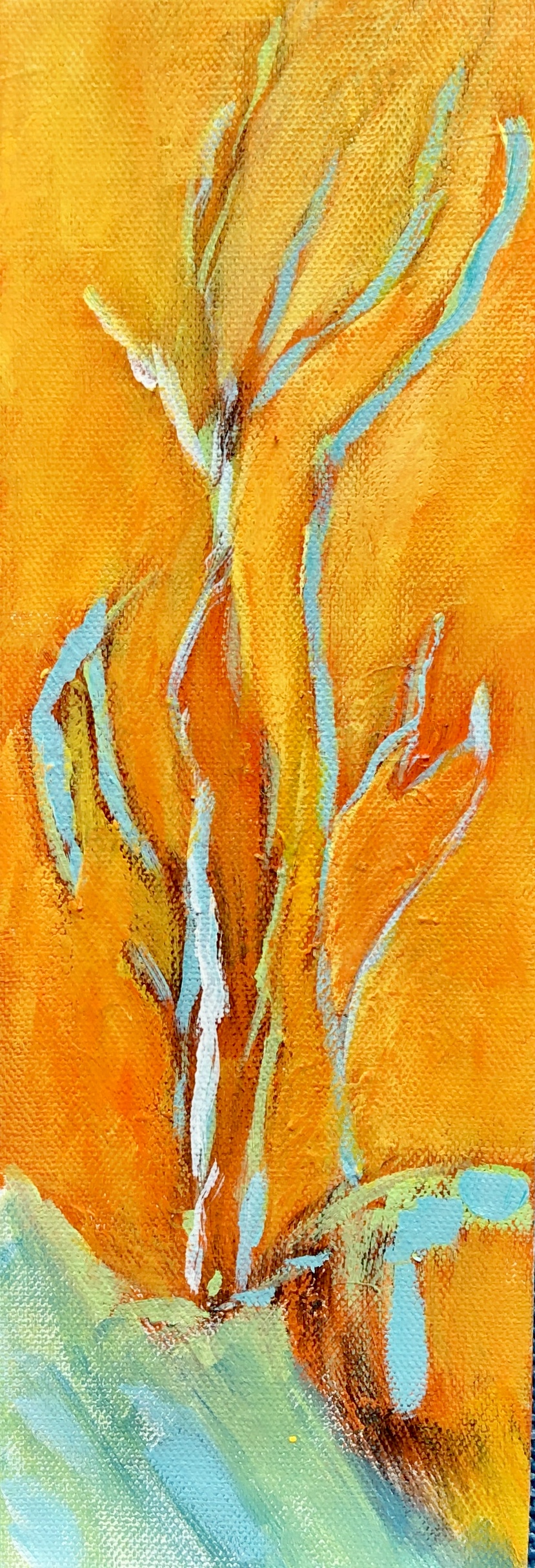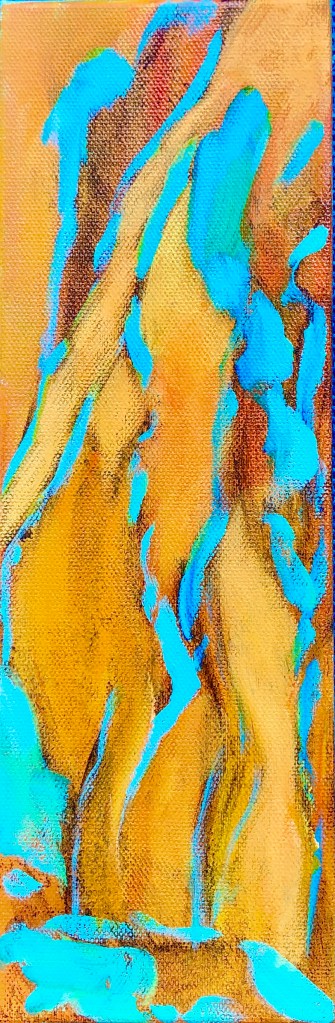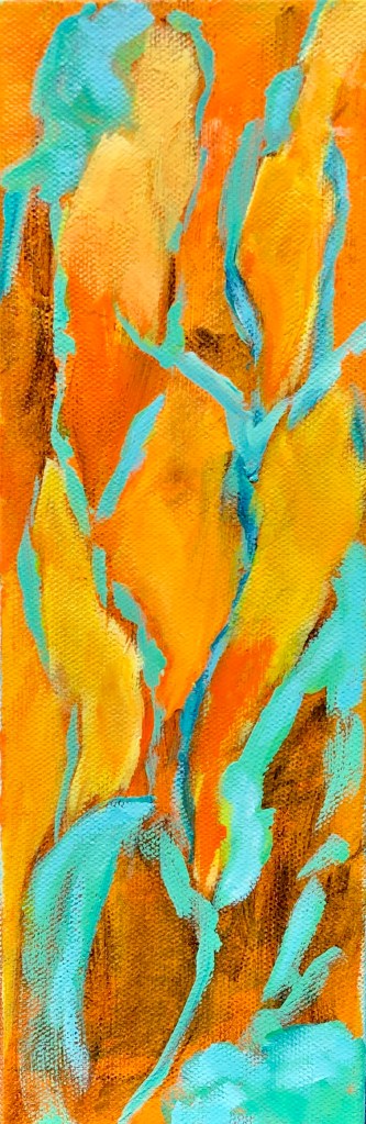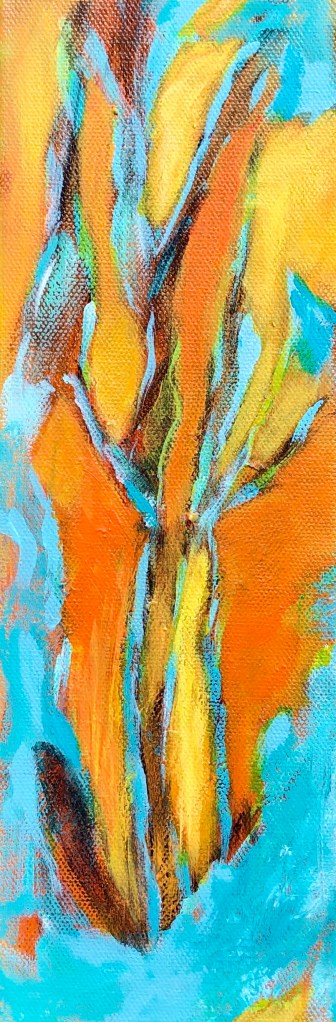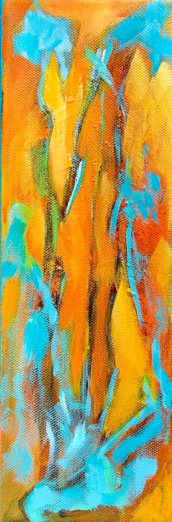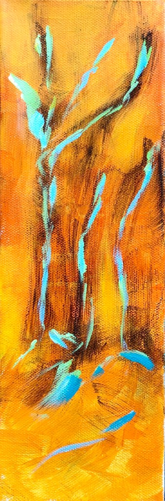 About the paintings: The yellow/orange paint represents my thoughts/words/prayers moving upward. The dancing trees: my rootedness to Mother Earth. The space between the branches: stained glass. Hence the title, Prayers.