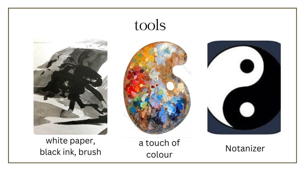 The tools we will use: white paper, black ink and a touch of translucent colour as well as one of my favourite apps, Notanizer.